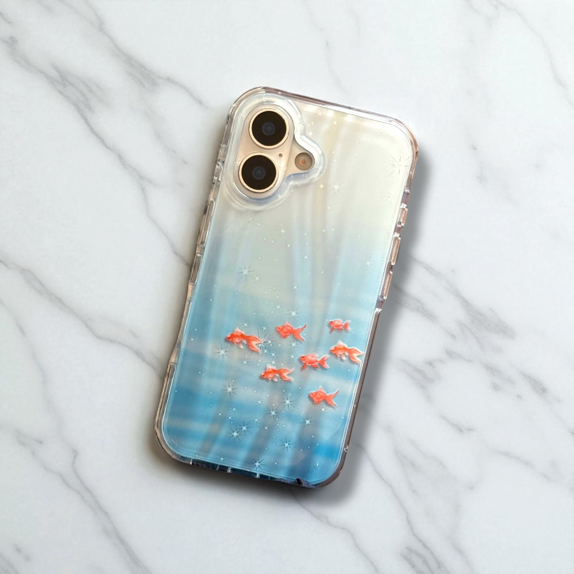 爽やかな水色の背面に、可愛い金魚たちが泳ぐデザインが印象的なiPhoneケース。光の角度によってツヤ感が変わり、手に取るだけで気分が明るくなります。