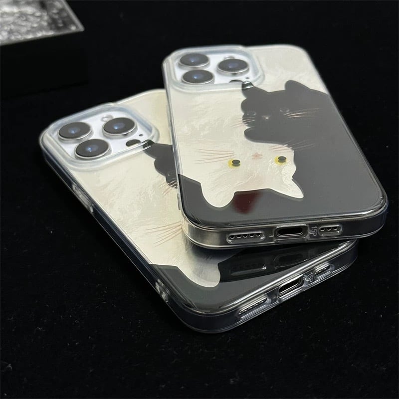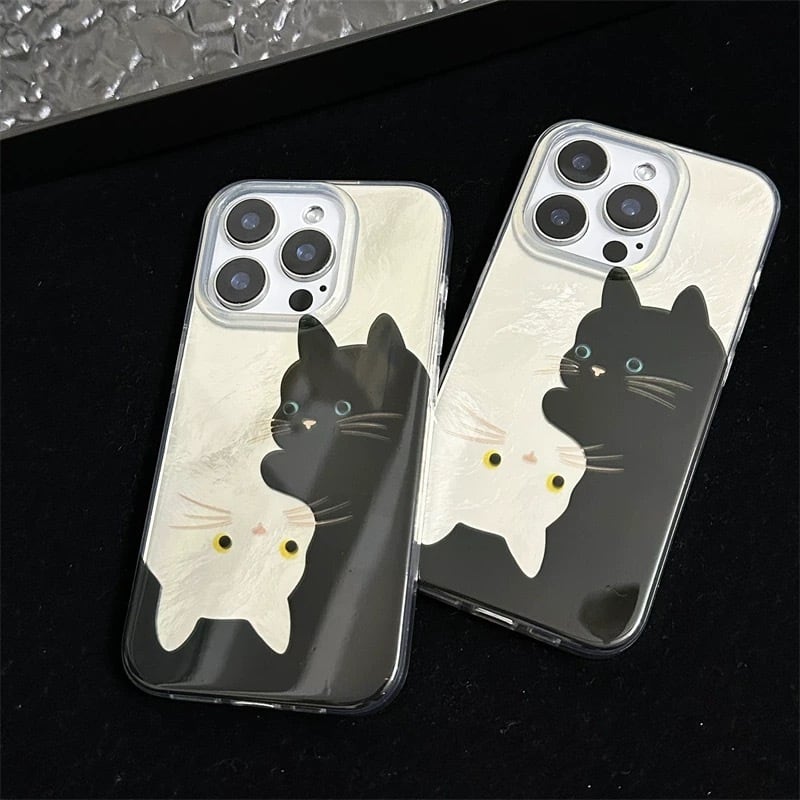 つややかなオーロラ調の背景に、黒猫と白猫が寄り添う姿が描かれたiPhoneケース。