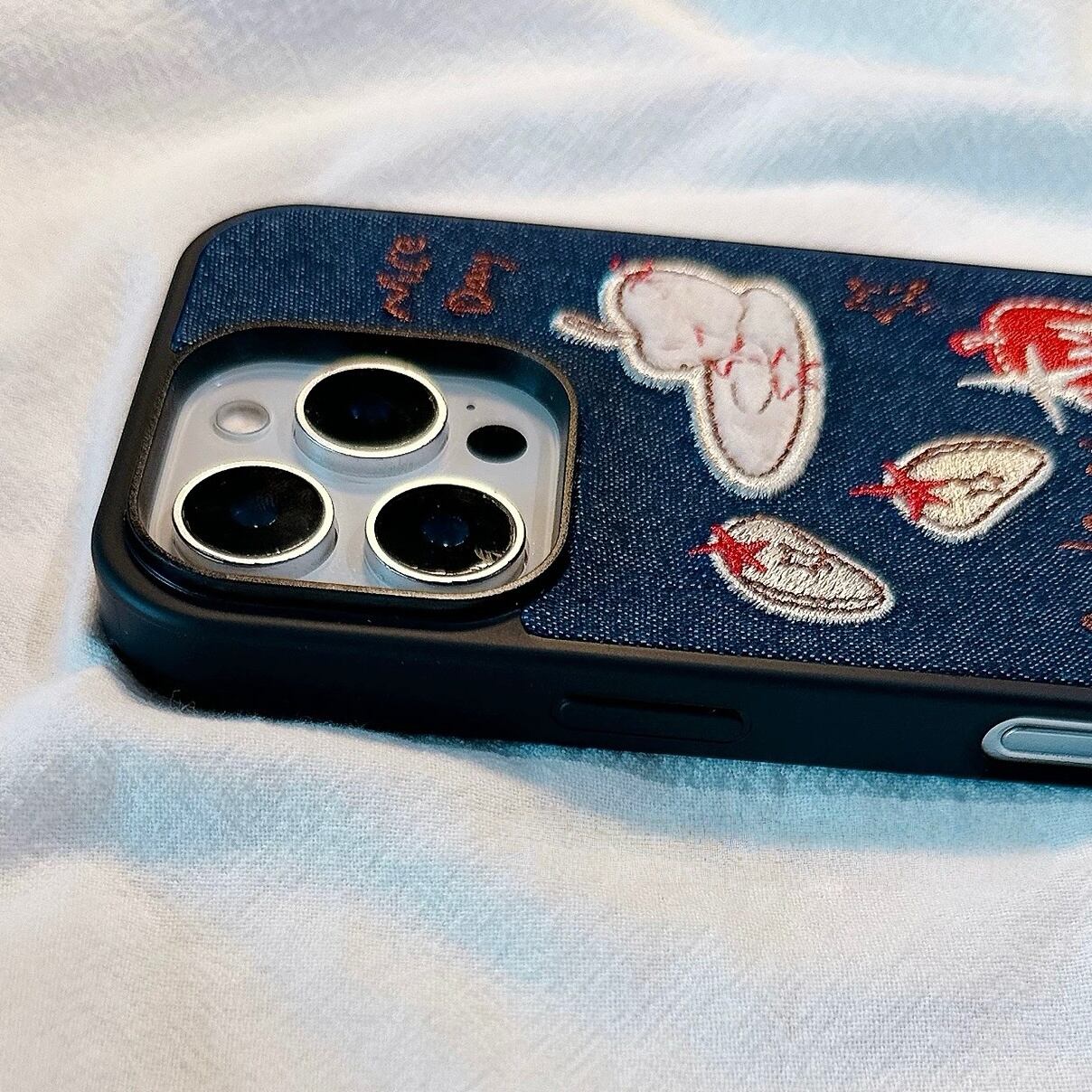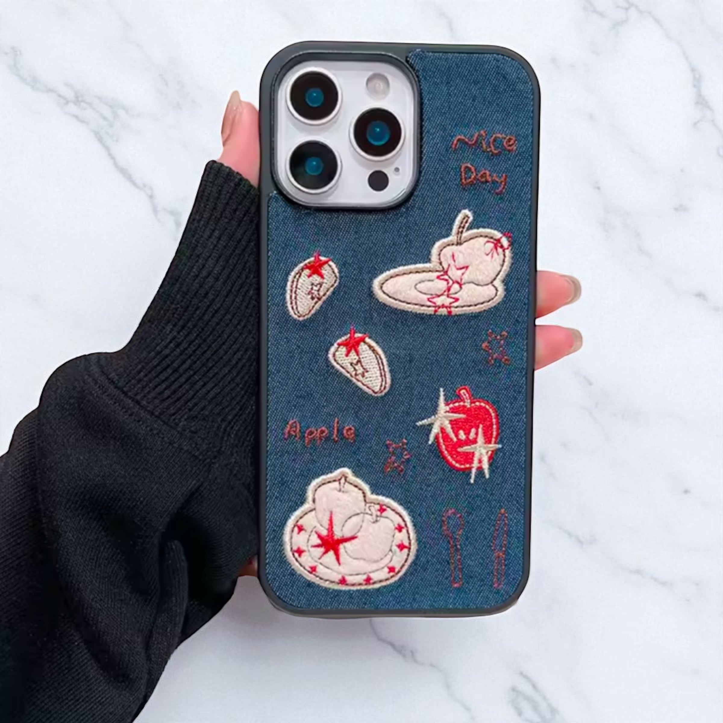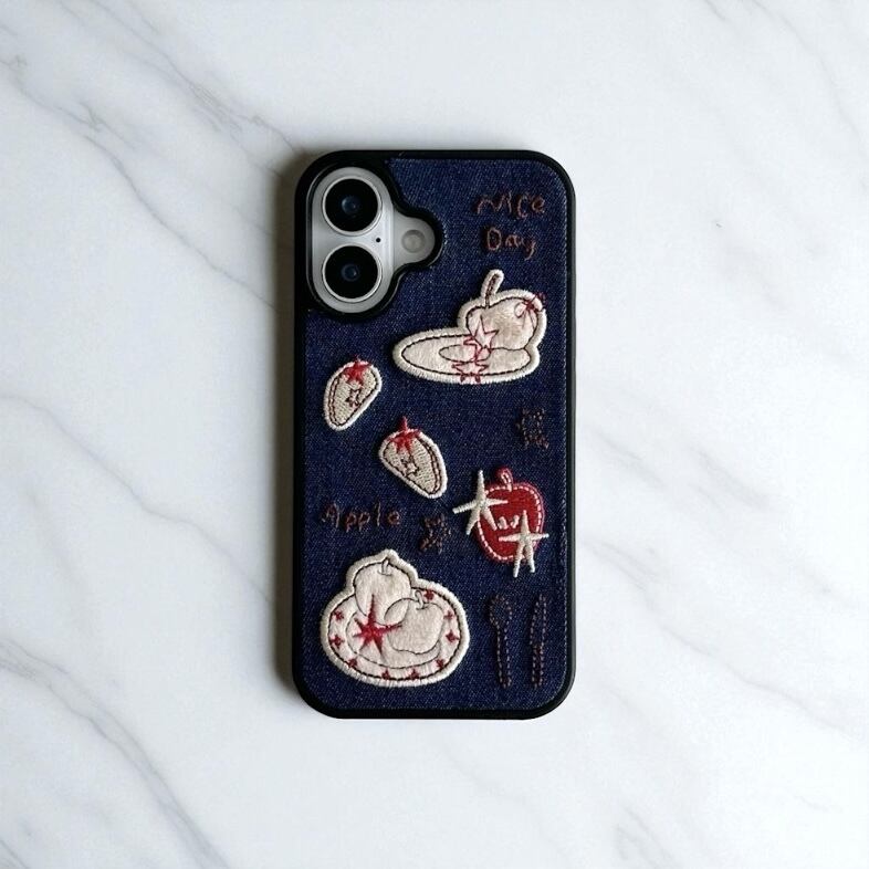 デニム生地に、りんごやスイーツをモチーフにしたアップリケ刺繍を施したiPhoneケース。
