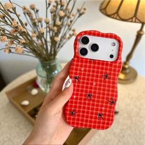 赤いチェック柄に小さなリボンが散りばめられた、ガーリーで心ときめくデザインのiPhoneケース。