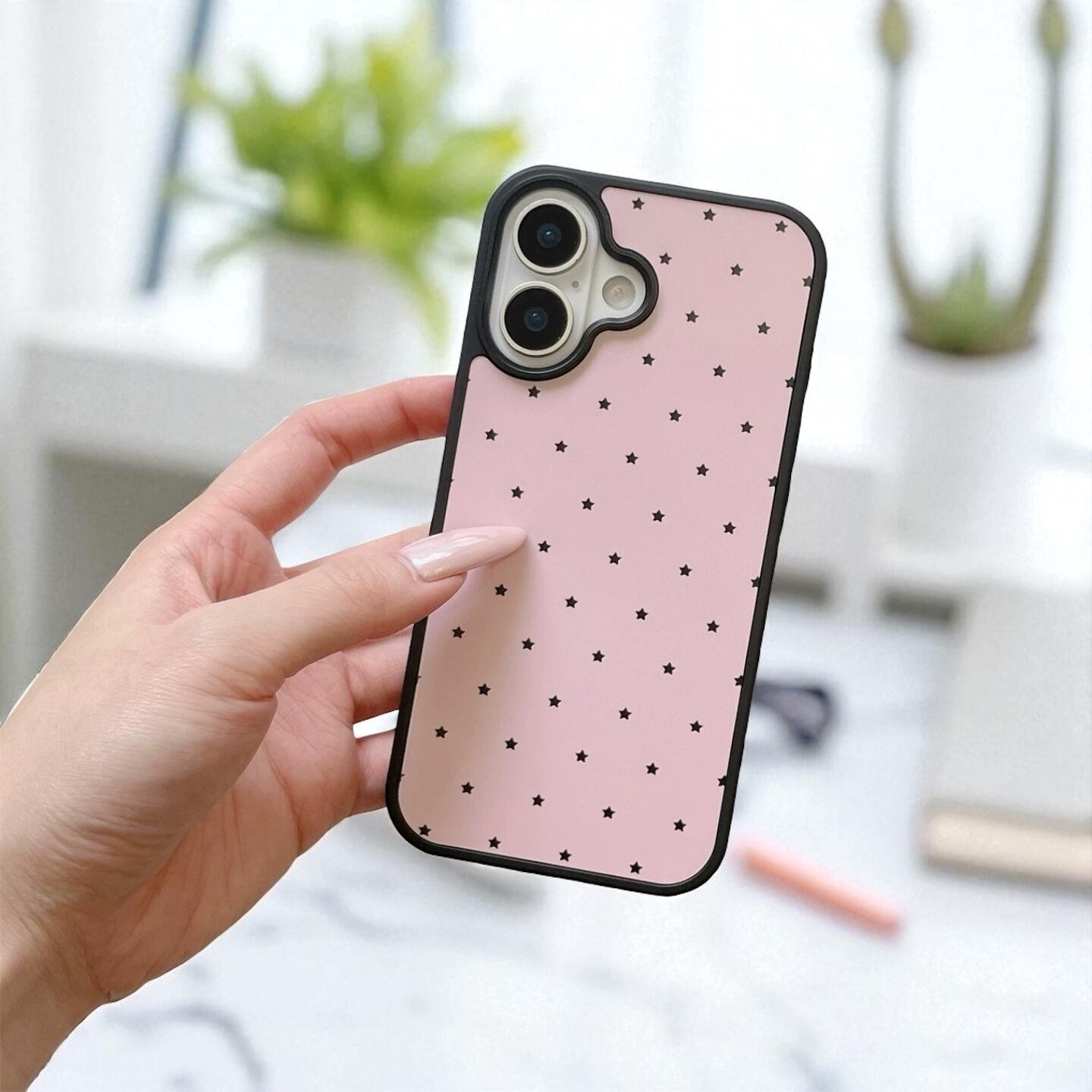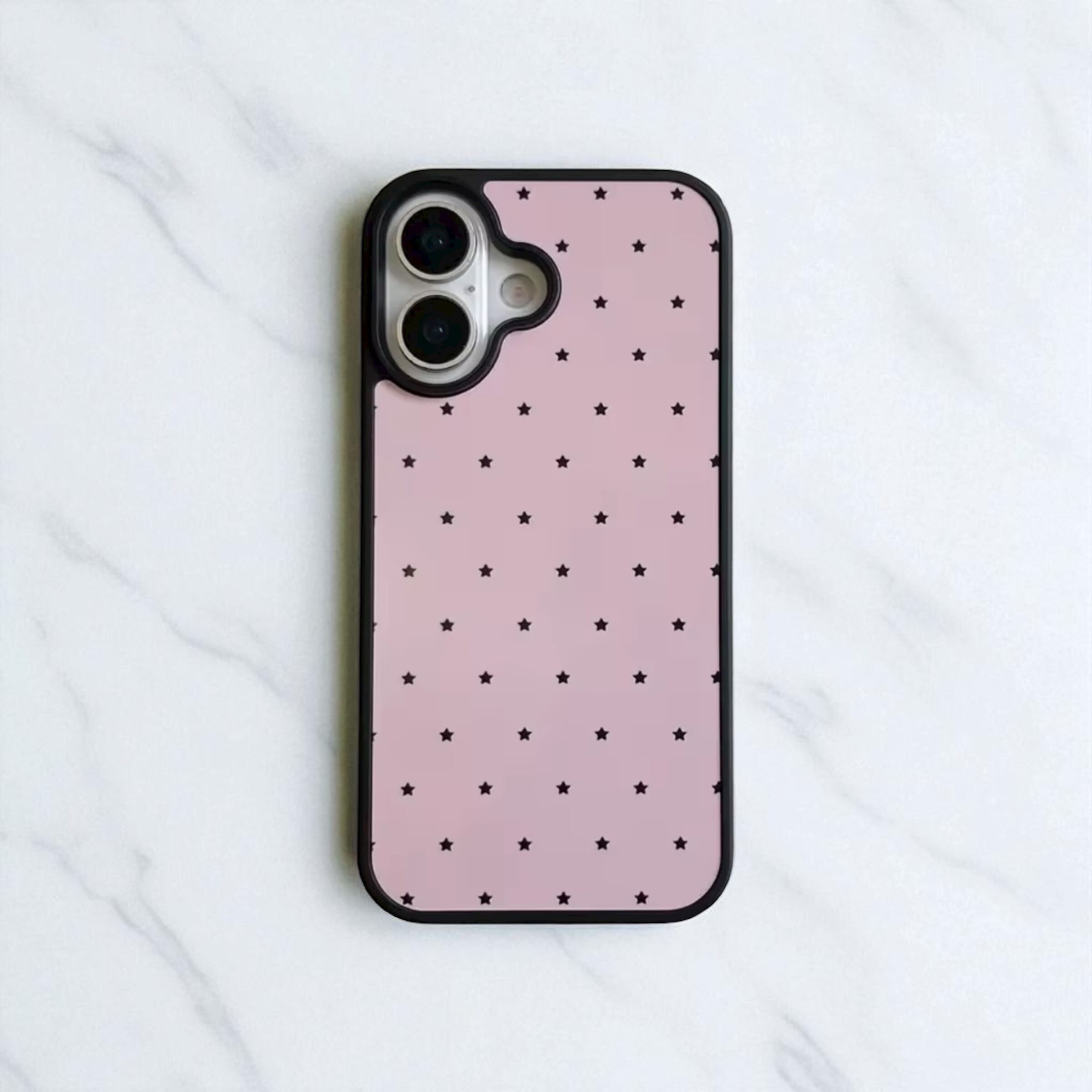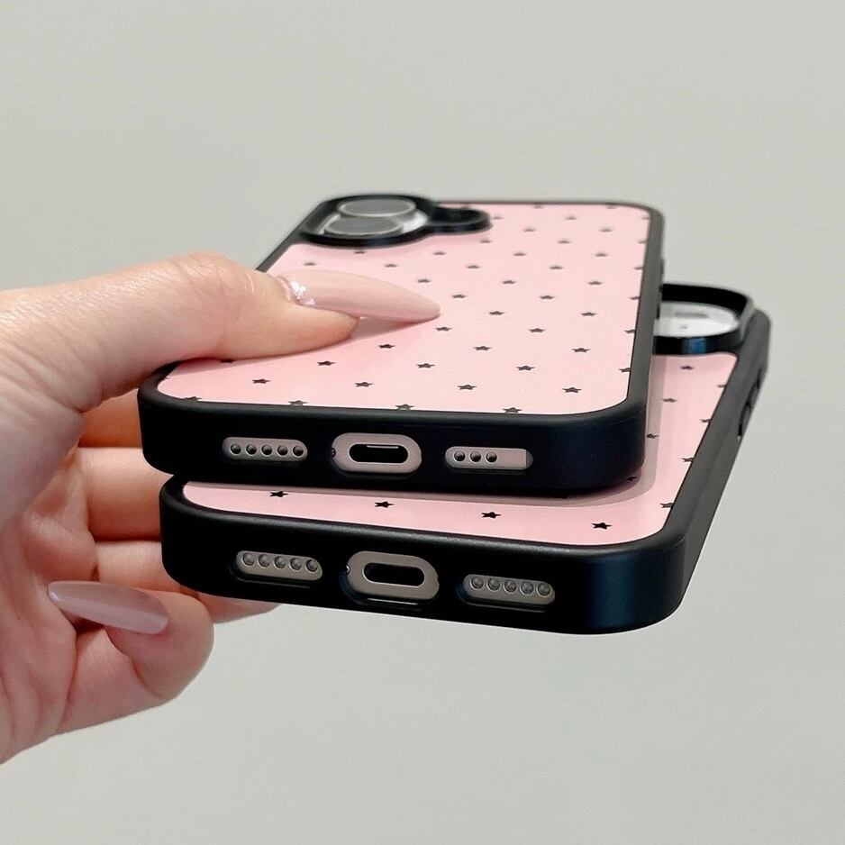 淡いピンクの背面に、ブラックの小さな星がちりばめられた大人可愛いiPhoneケース。シンプルだけど愛らしいデザインで、持つたびに気分を上げてくれます。