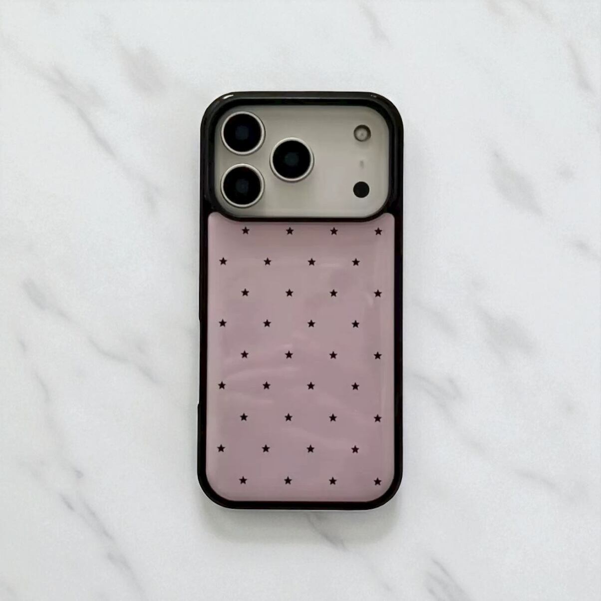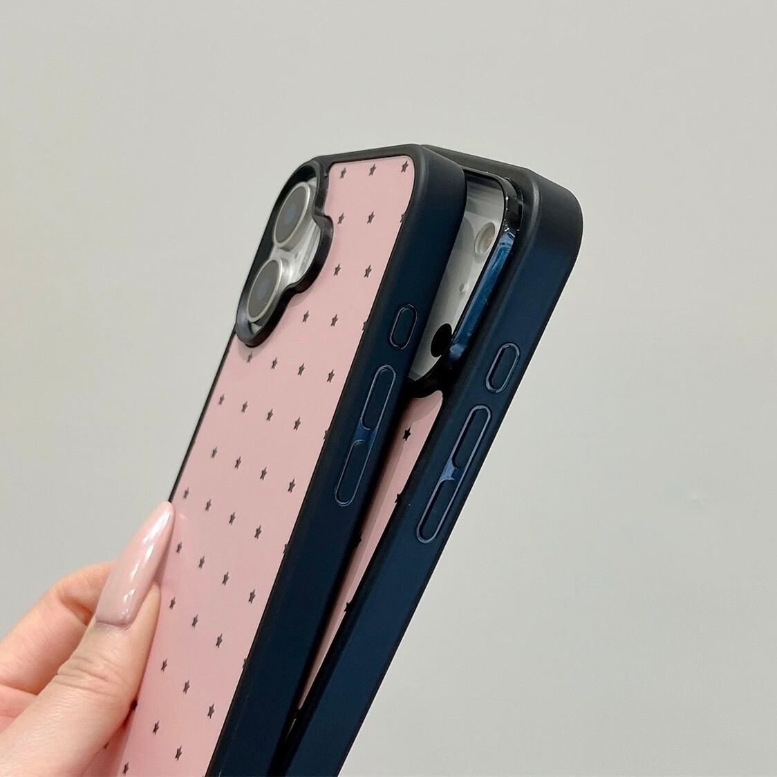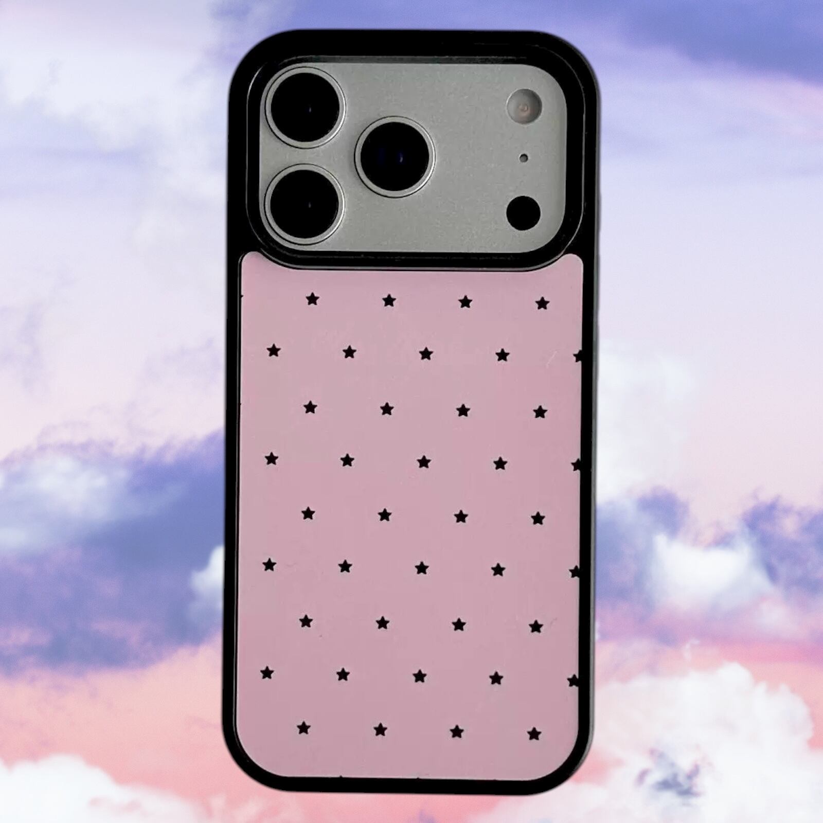 淡いピンクの背面に、ブラックの小さな星がちりばめられた大人可愛いiPhoneケース。シンプルだけど愛らしいデザインで、持つたびに気分を上げてくれます。