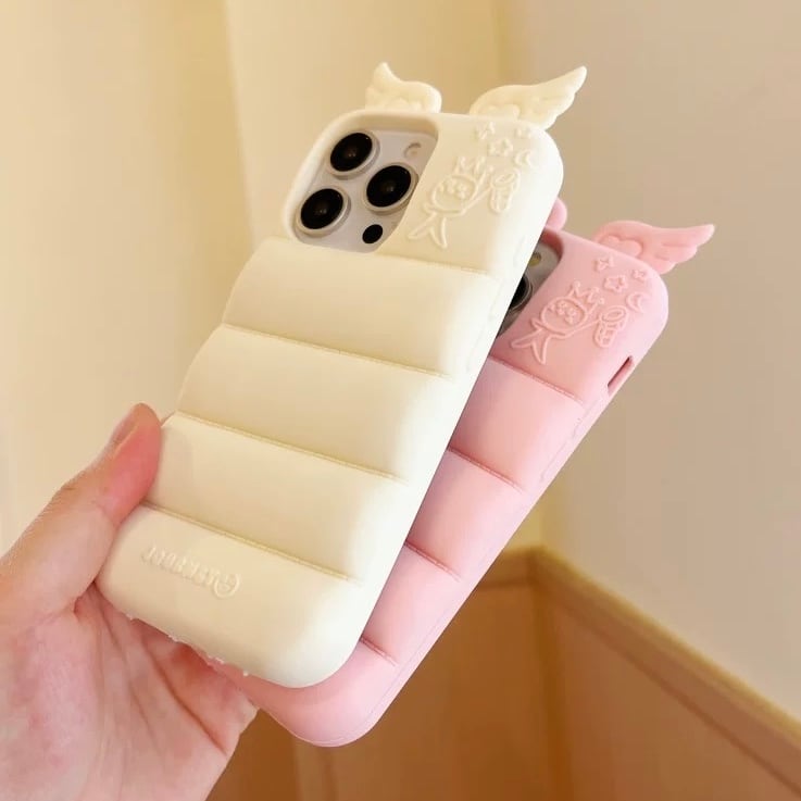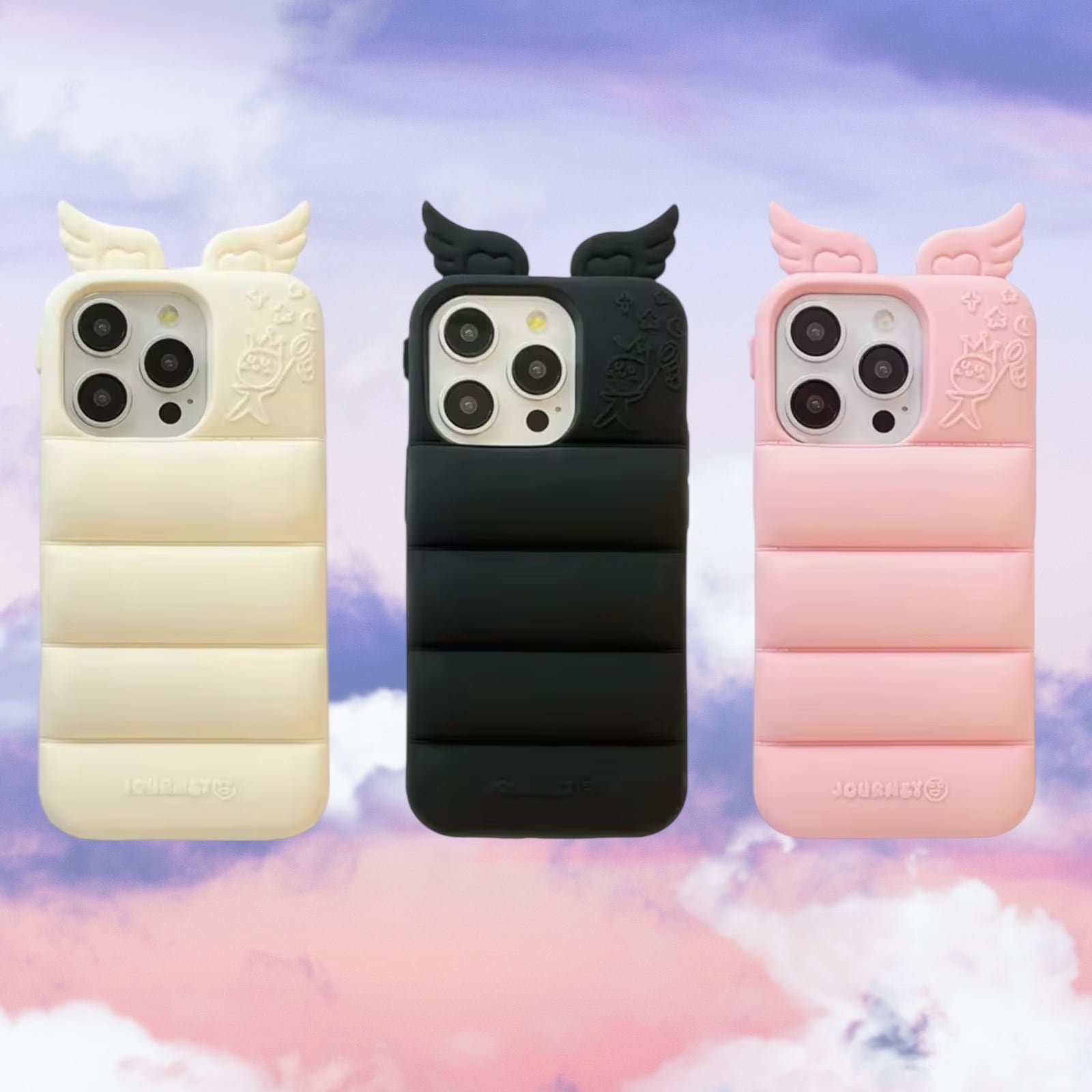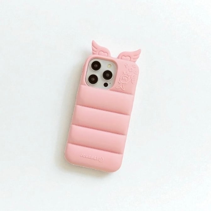 ふっくらとした立体シルエットと、頭上の“天使の羽”がポイントのiPhoneケース。