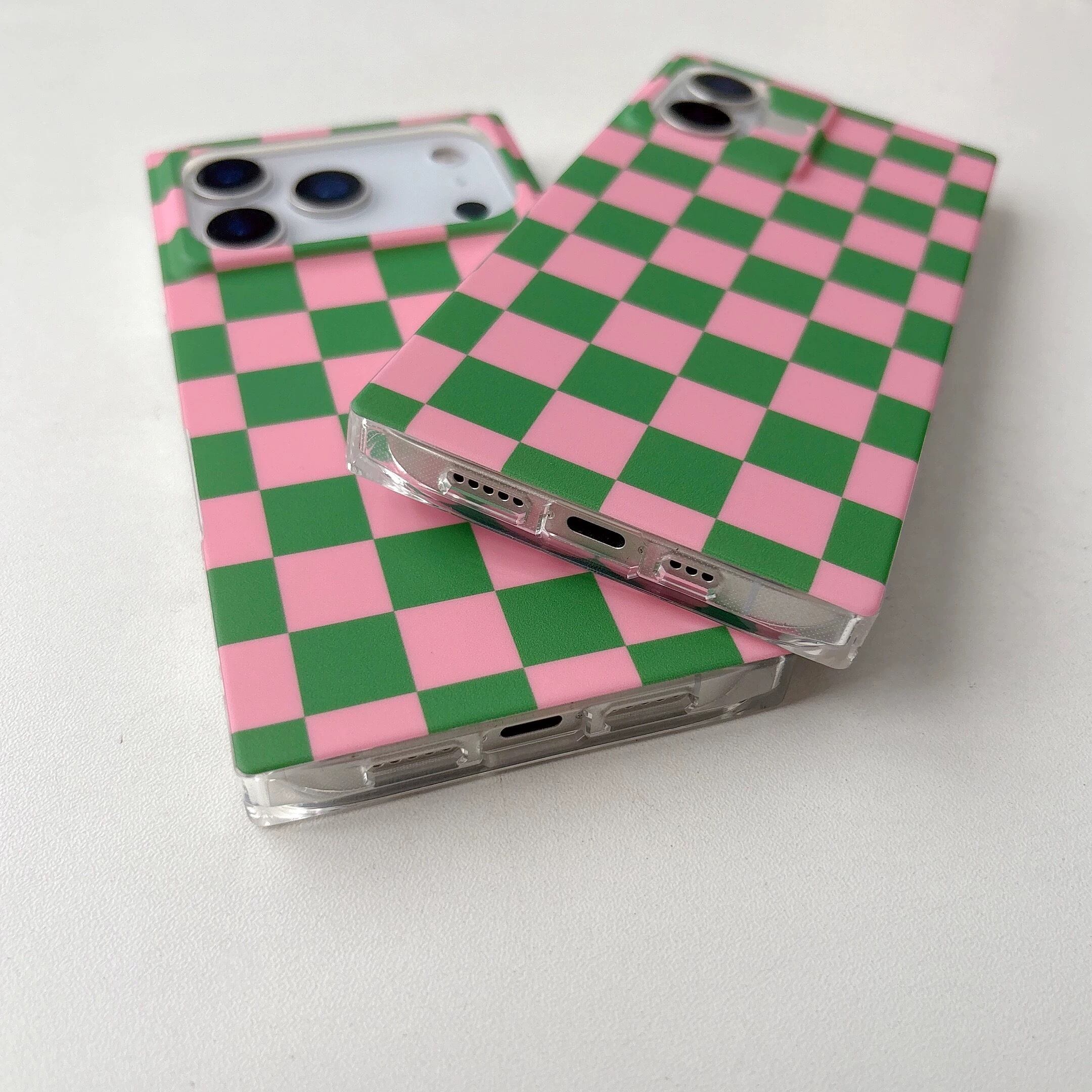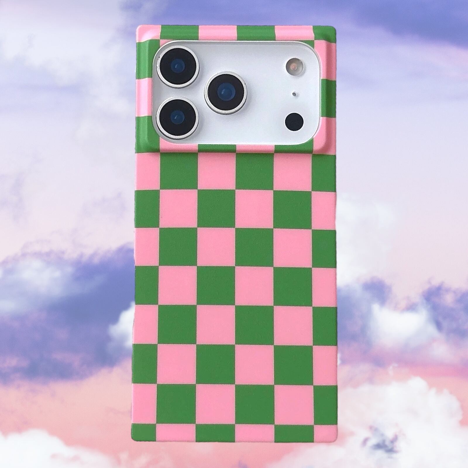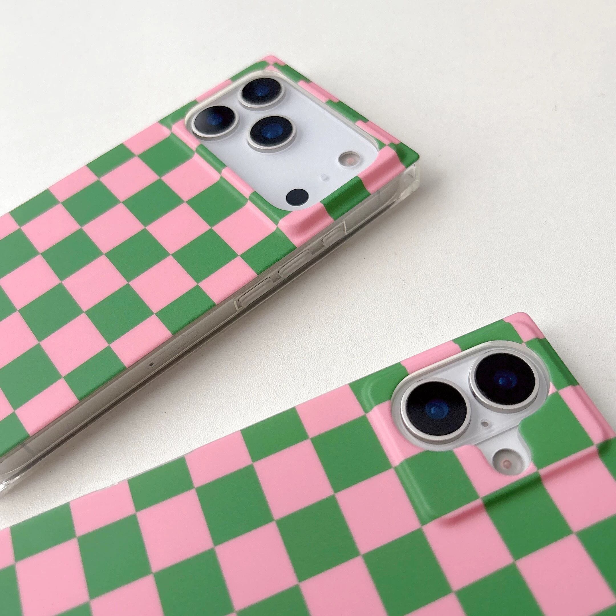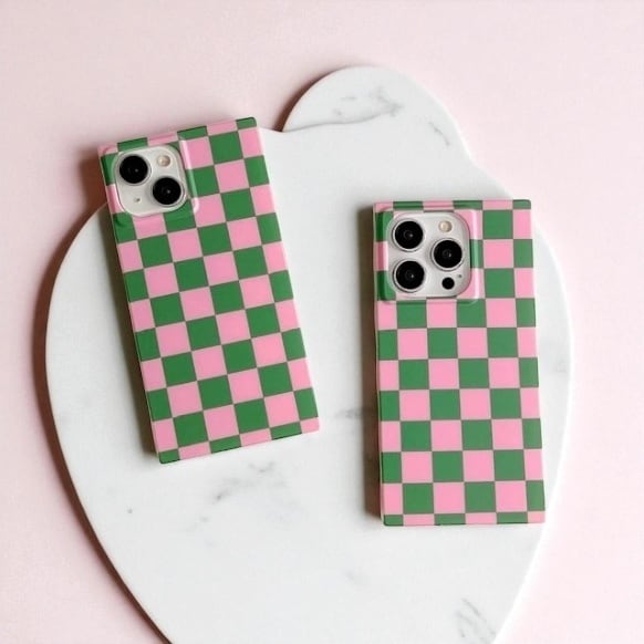 ポップでおしゃれなピンク×グリーンのチェック柄が目を惹く、スクエア型iPhoneケース。