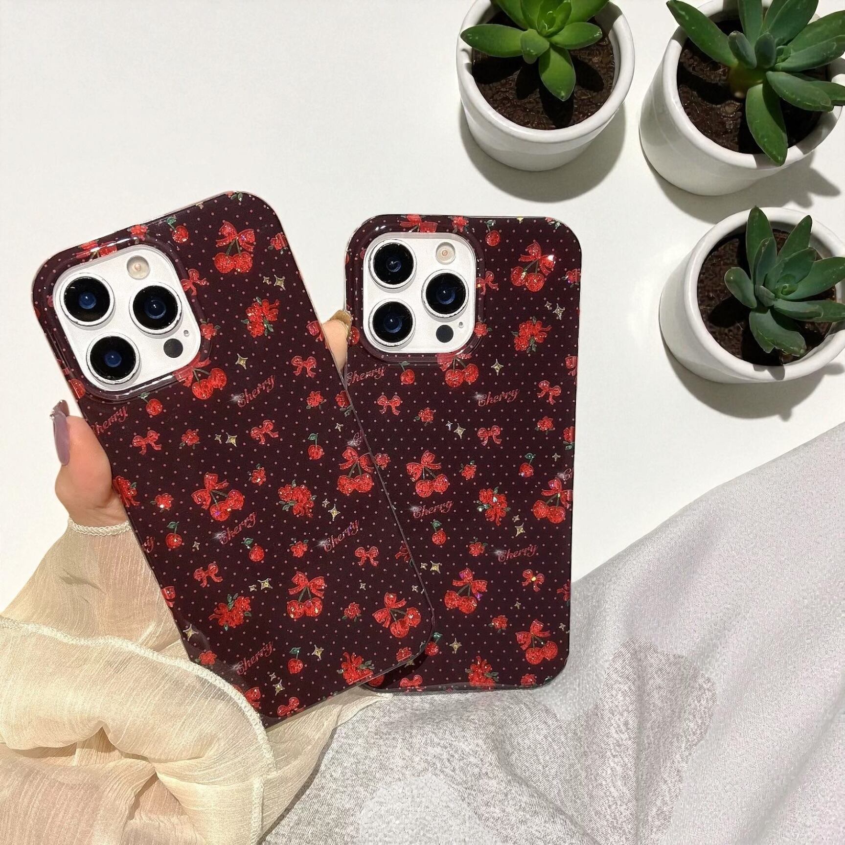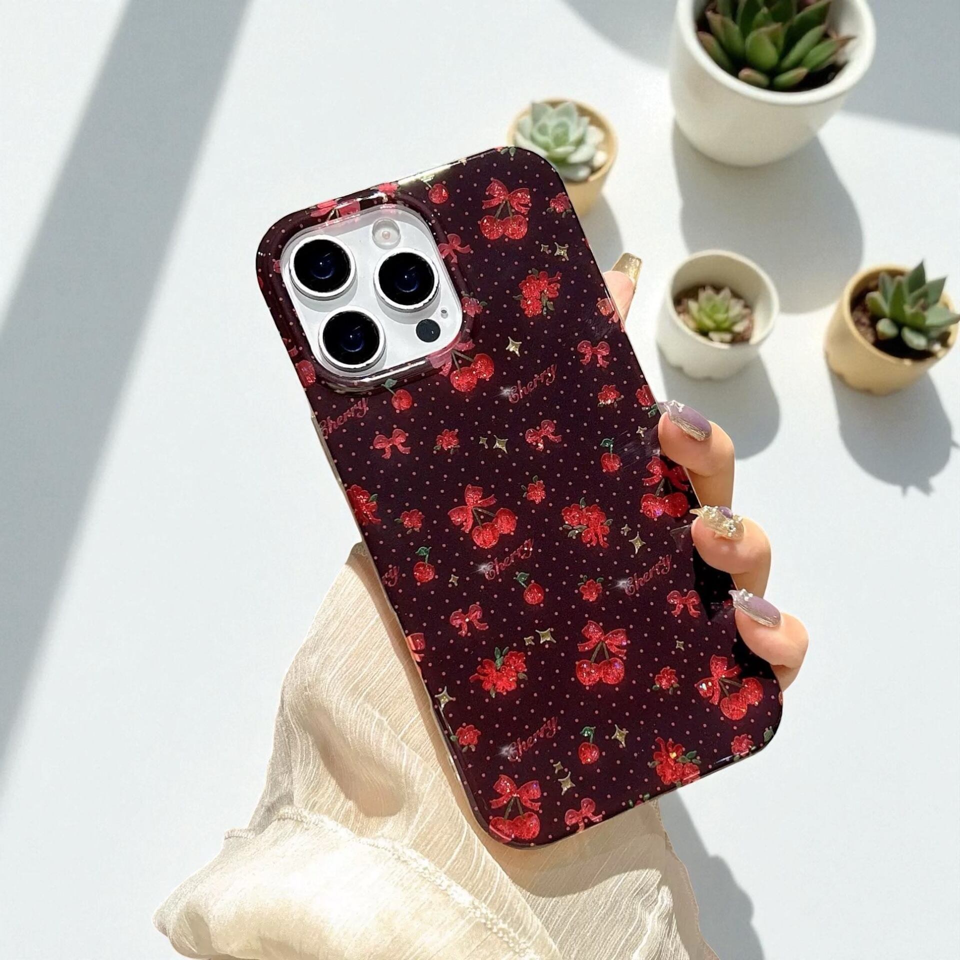 深みのあるワインレッドに、ドットとさくらんぼ、リボンが散りばめられたラブリーなiPhoneケース。
