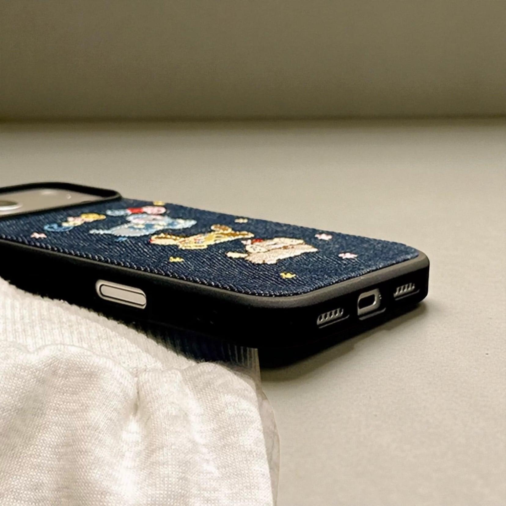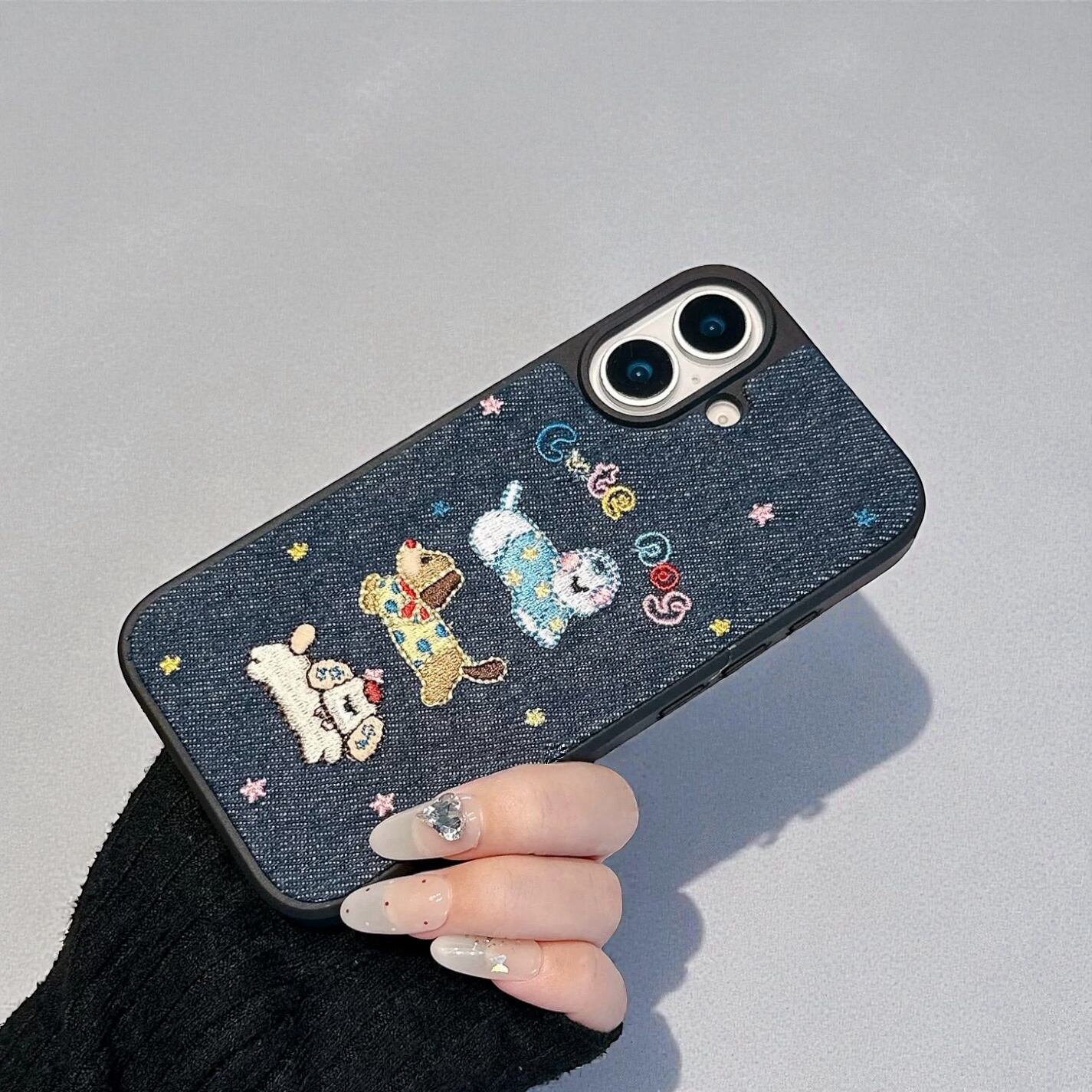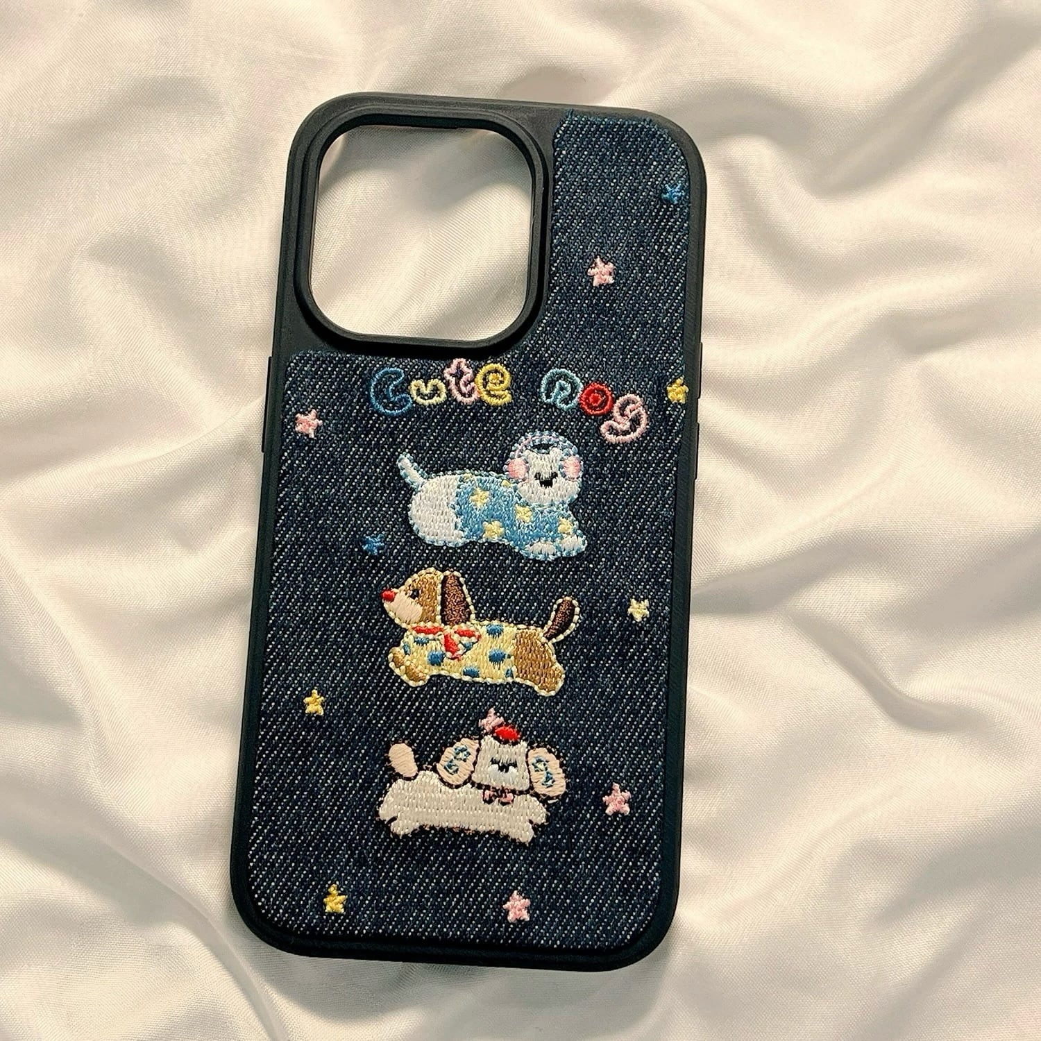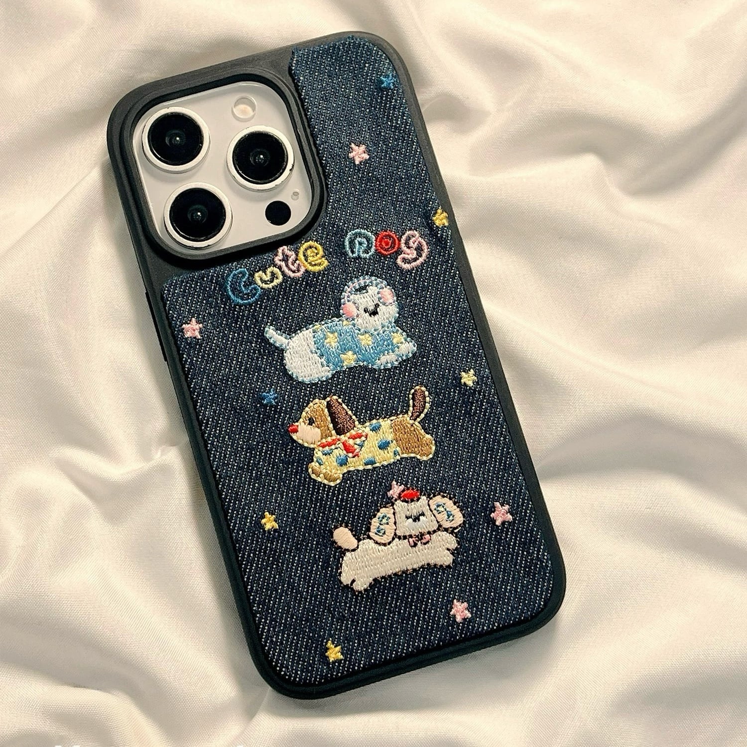 ワンちゃん 刺繍 デニム iPhoneケース | スマホケース iPhone ケース アイフォンケース | 機種 iPhone 14 15 16 17 Pro Max シリーズ