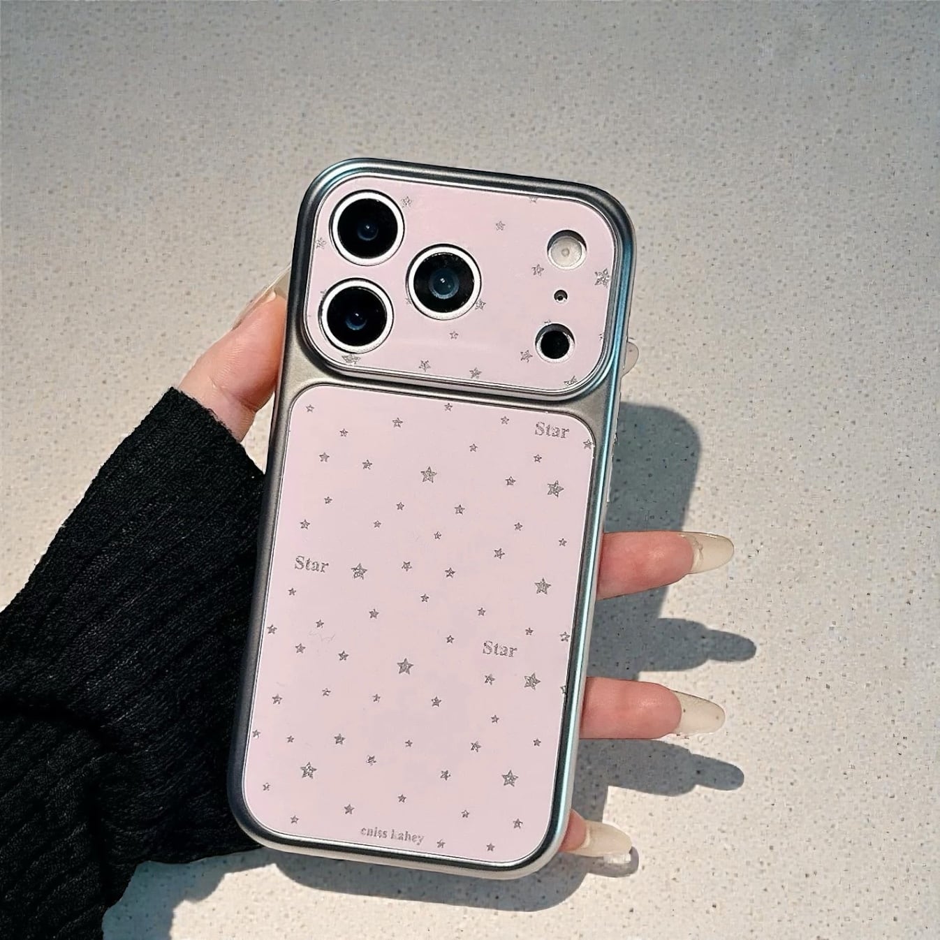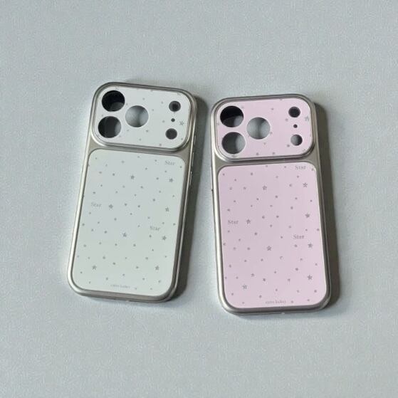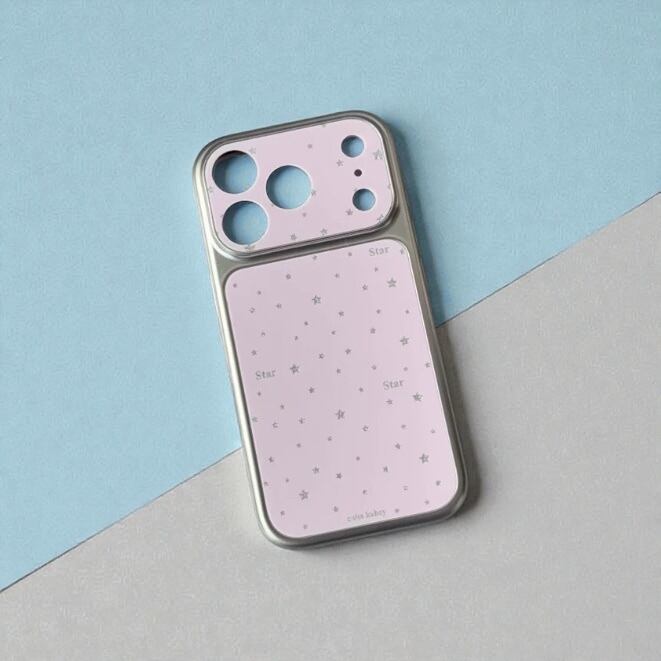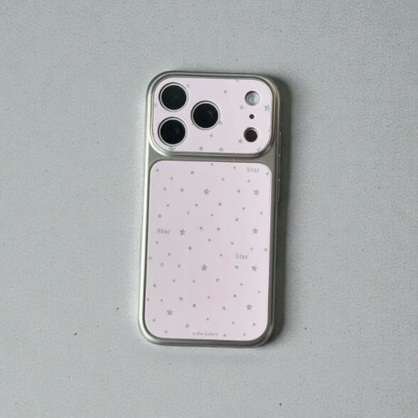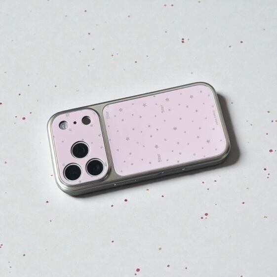 淡いピンクとホワイトに散りばめられた星柄が、スマホをそっと華やかに彩るiPhoneケース。
