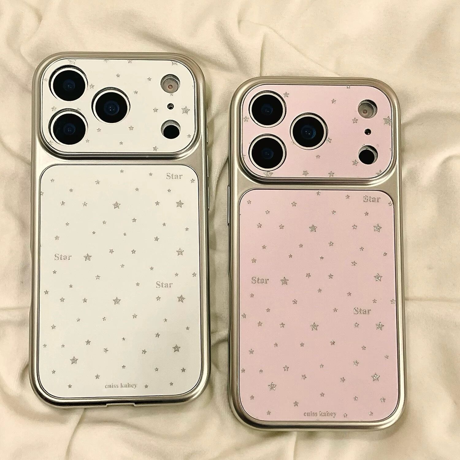 星柄 スター シルバーフレーム iPhoneケース (ホワイト/ピンク) | スマホケース iPhone ケース アイフォンケース | 機種 iPhone 14 15 16 17 Pro Max シリーズ