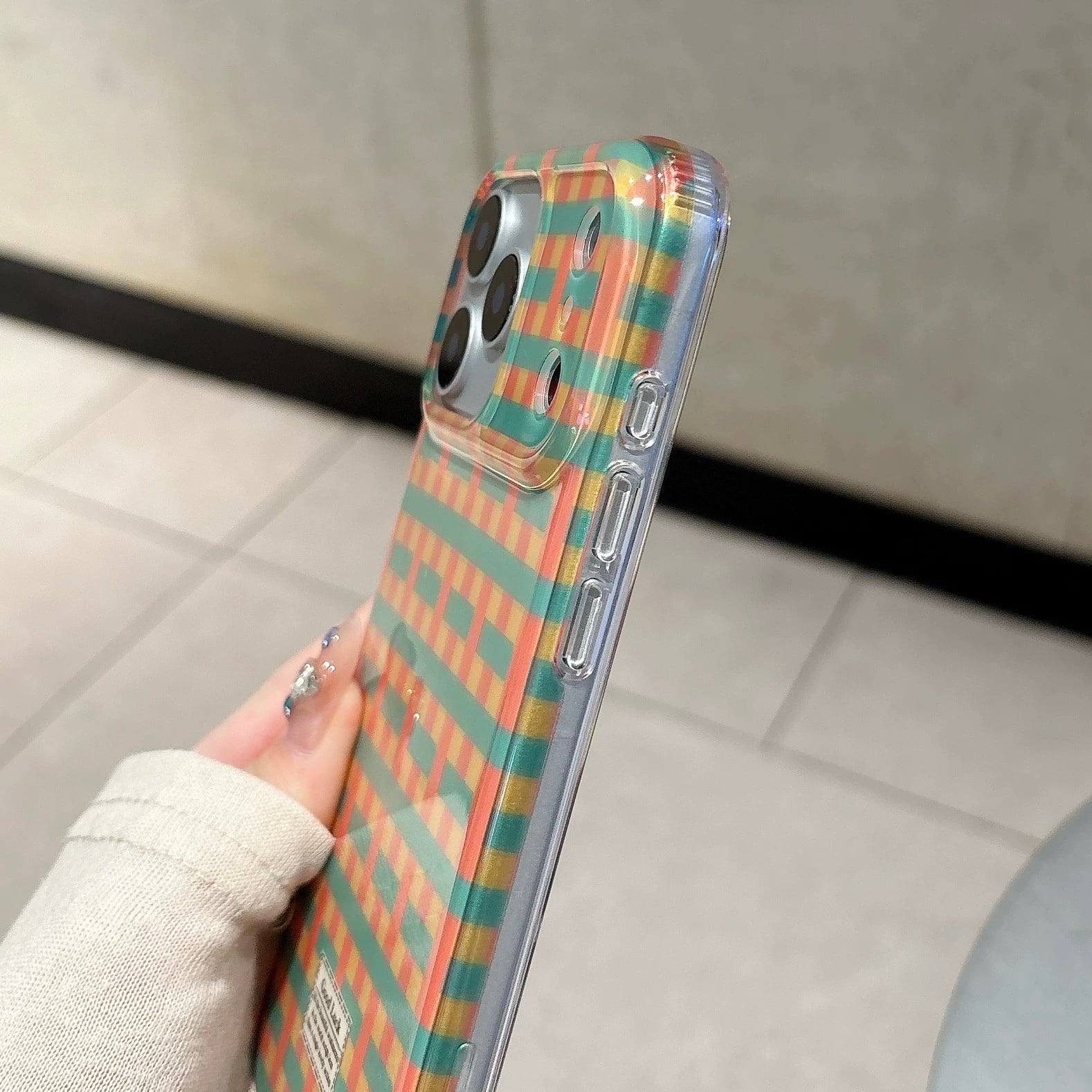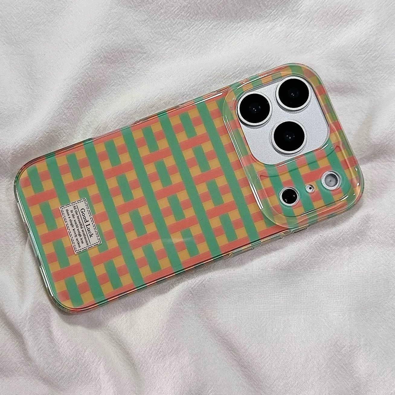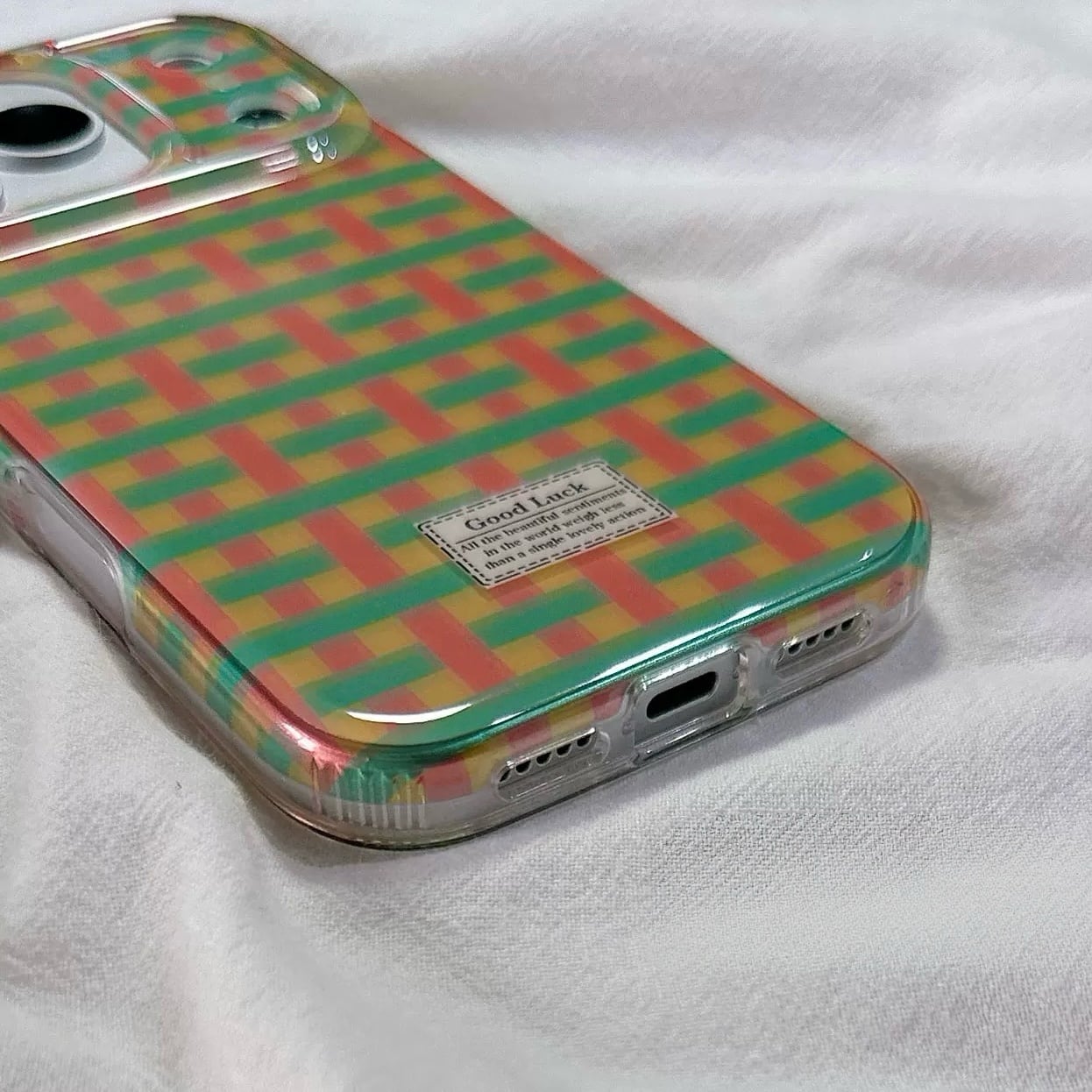 カラフルなチェック柄が目を引く、明るく楽しいデザインのiPhoneケース。