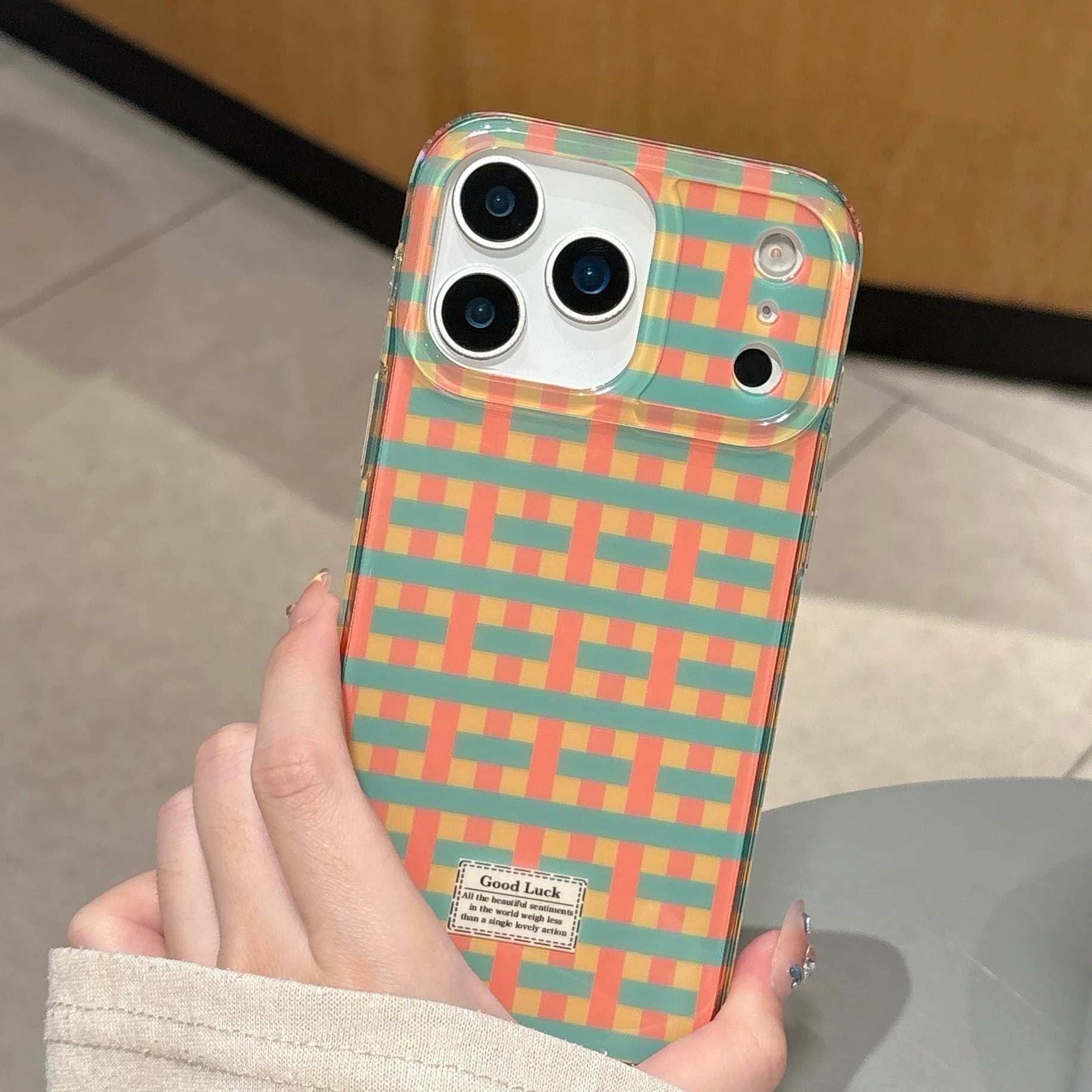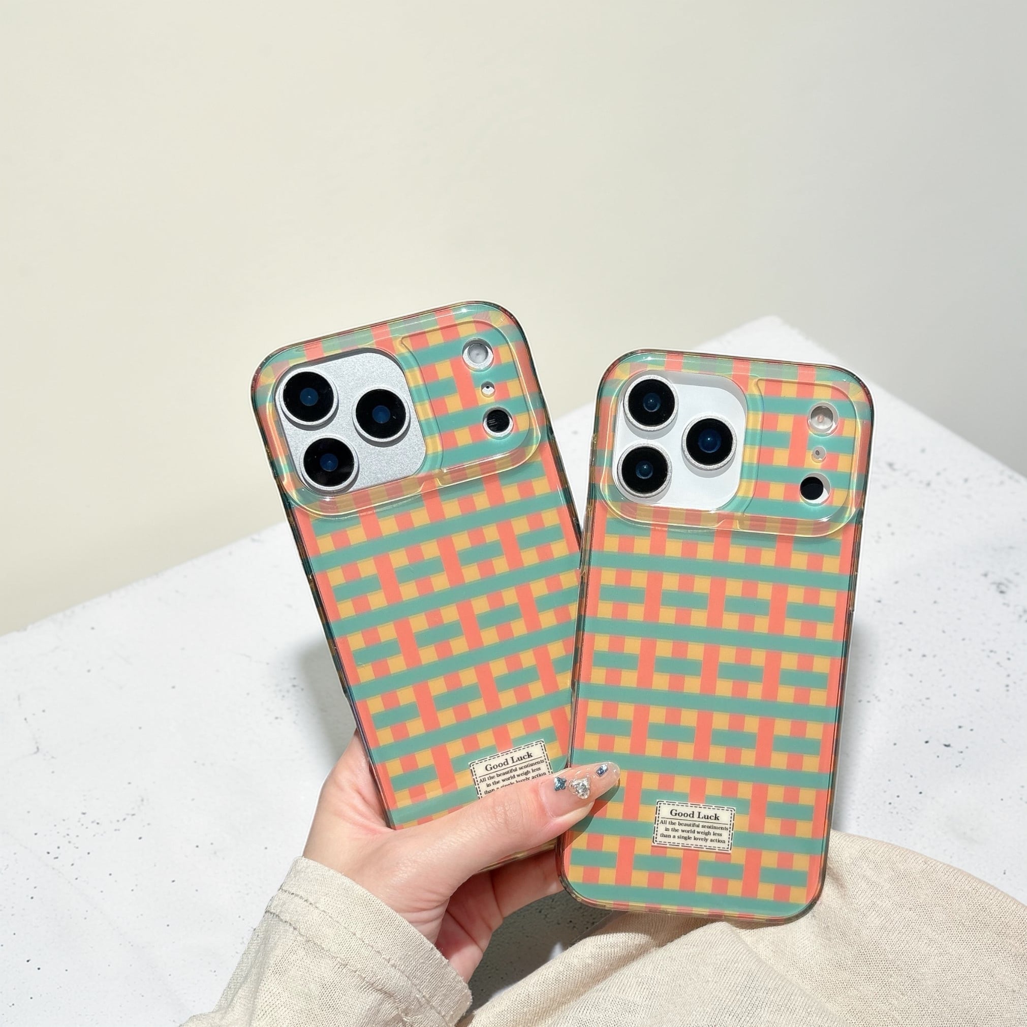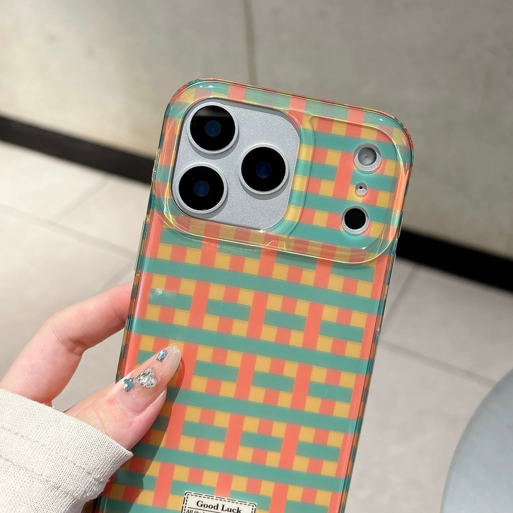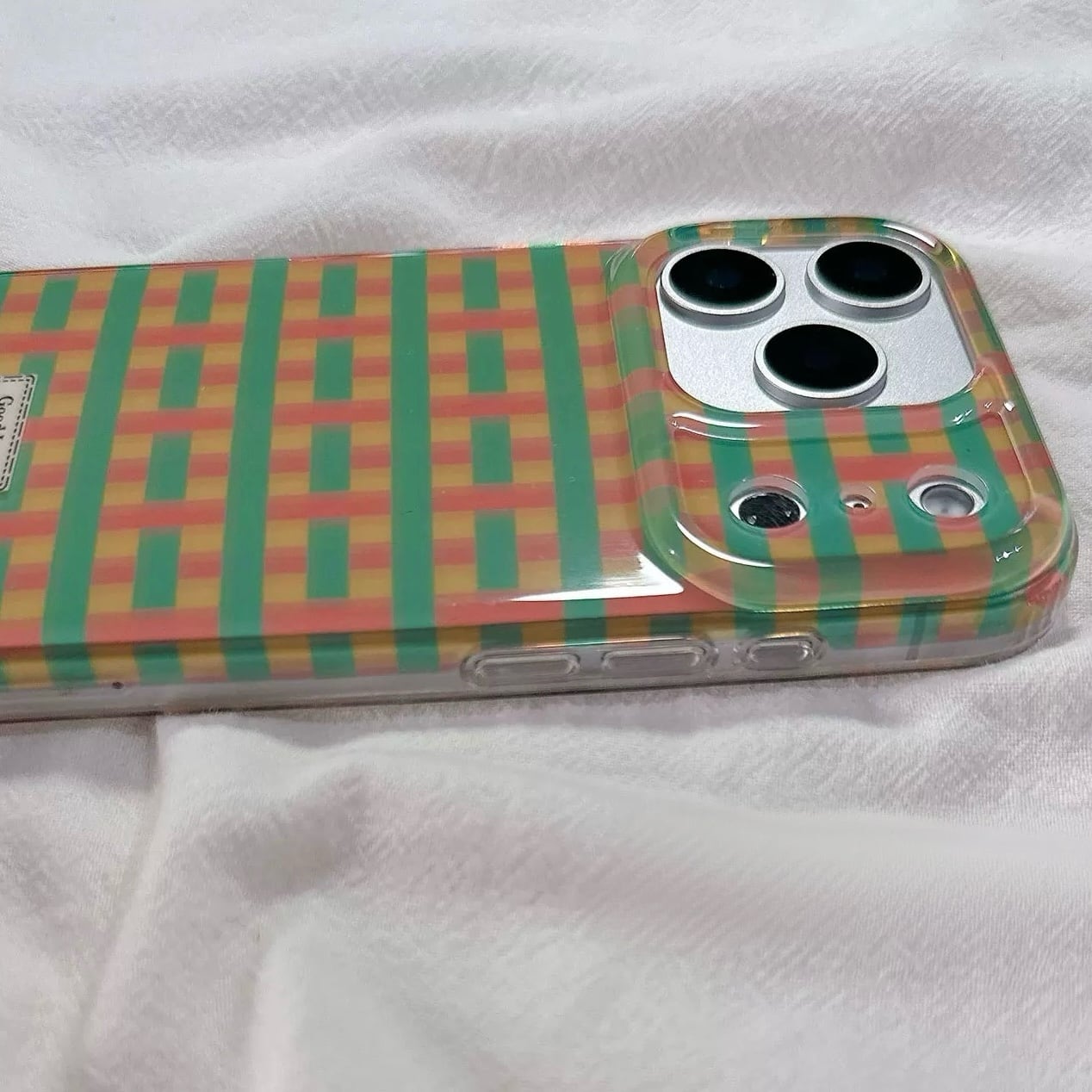 カラフルなチェック柄が目を引く、明るく楽しいデザインのiPhoneケース。