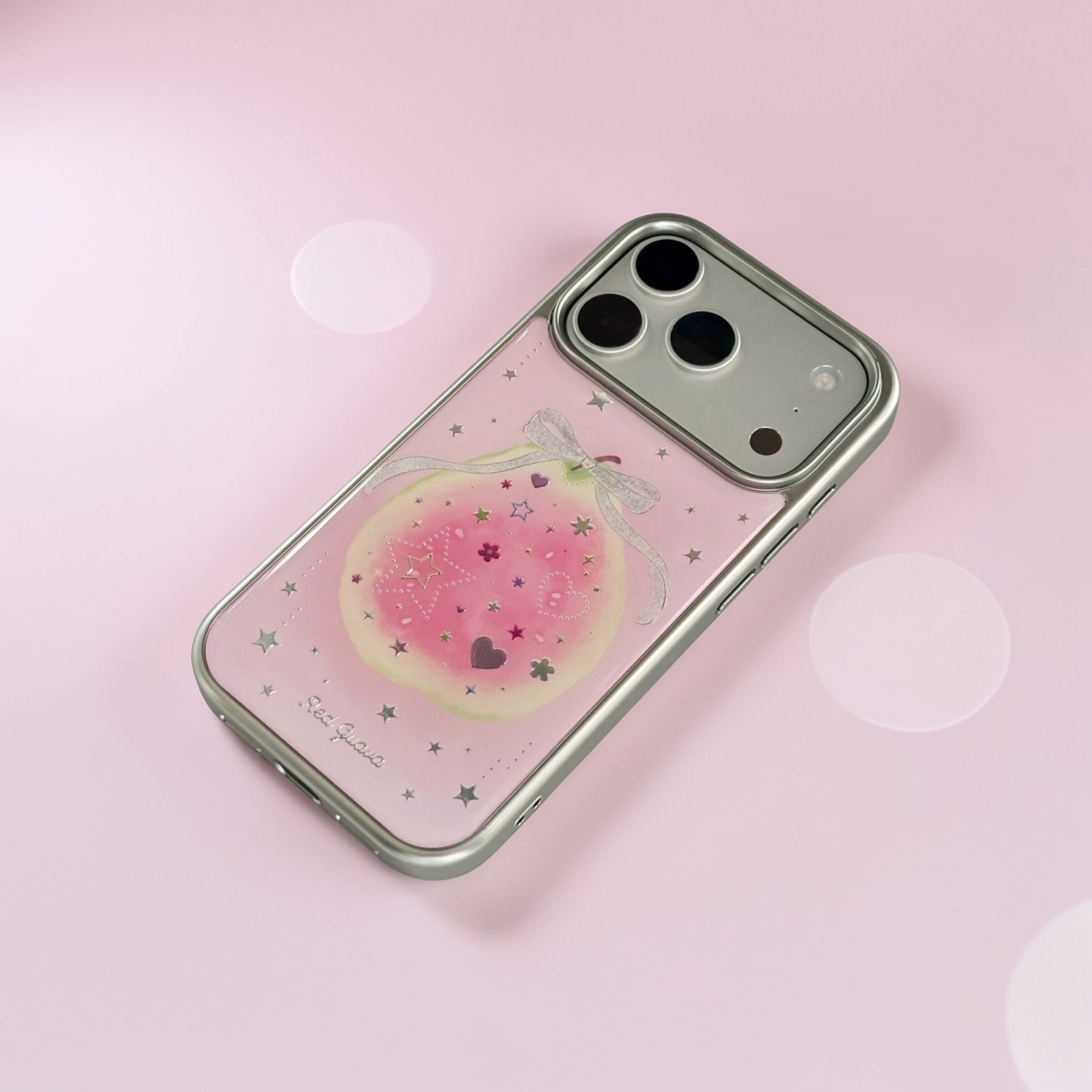 ほんのりピンクの背景に、きらきらと輝くグァバデザインをあしらった華やかなケース。