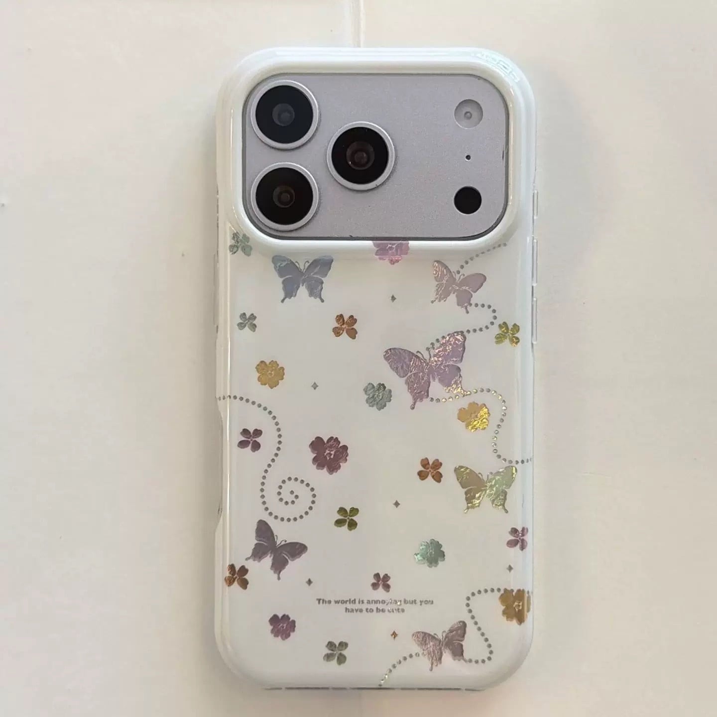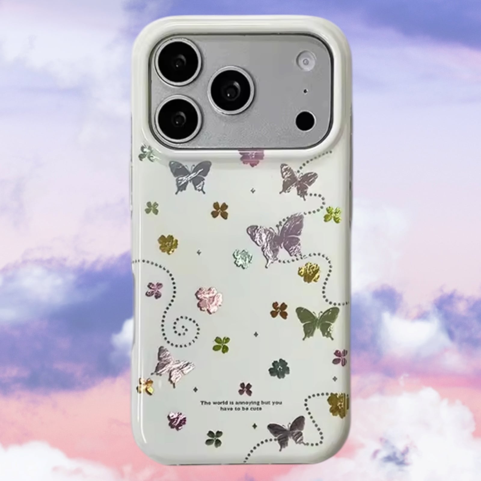 やわらかなホワイトカラーの中に、オーロラに輝く蝶々と小花を散りばめたiPhoneケース。