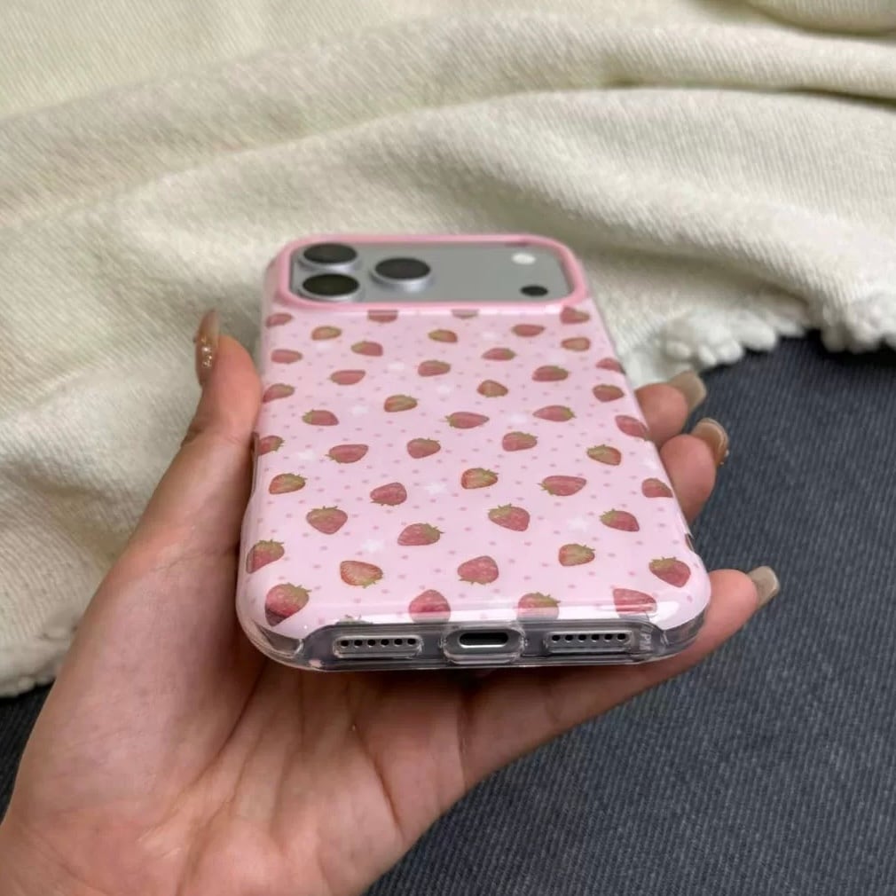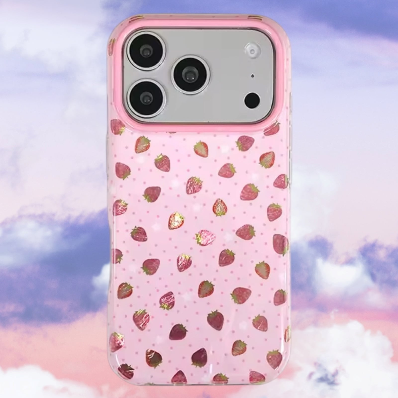 やさしいピンクカラーに、小さな苺が散りばめられた可愛いiPhoneケース。