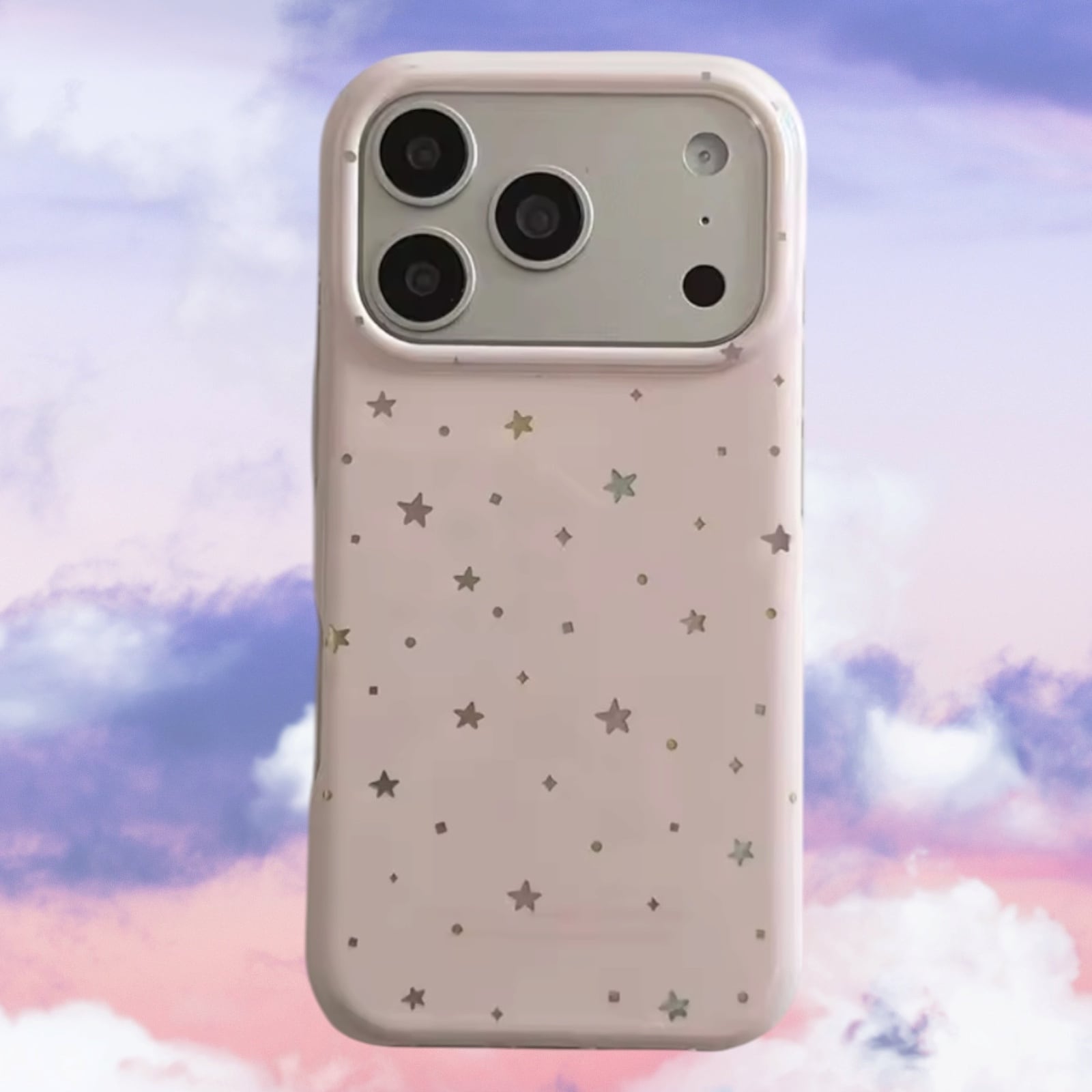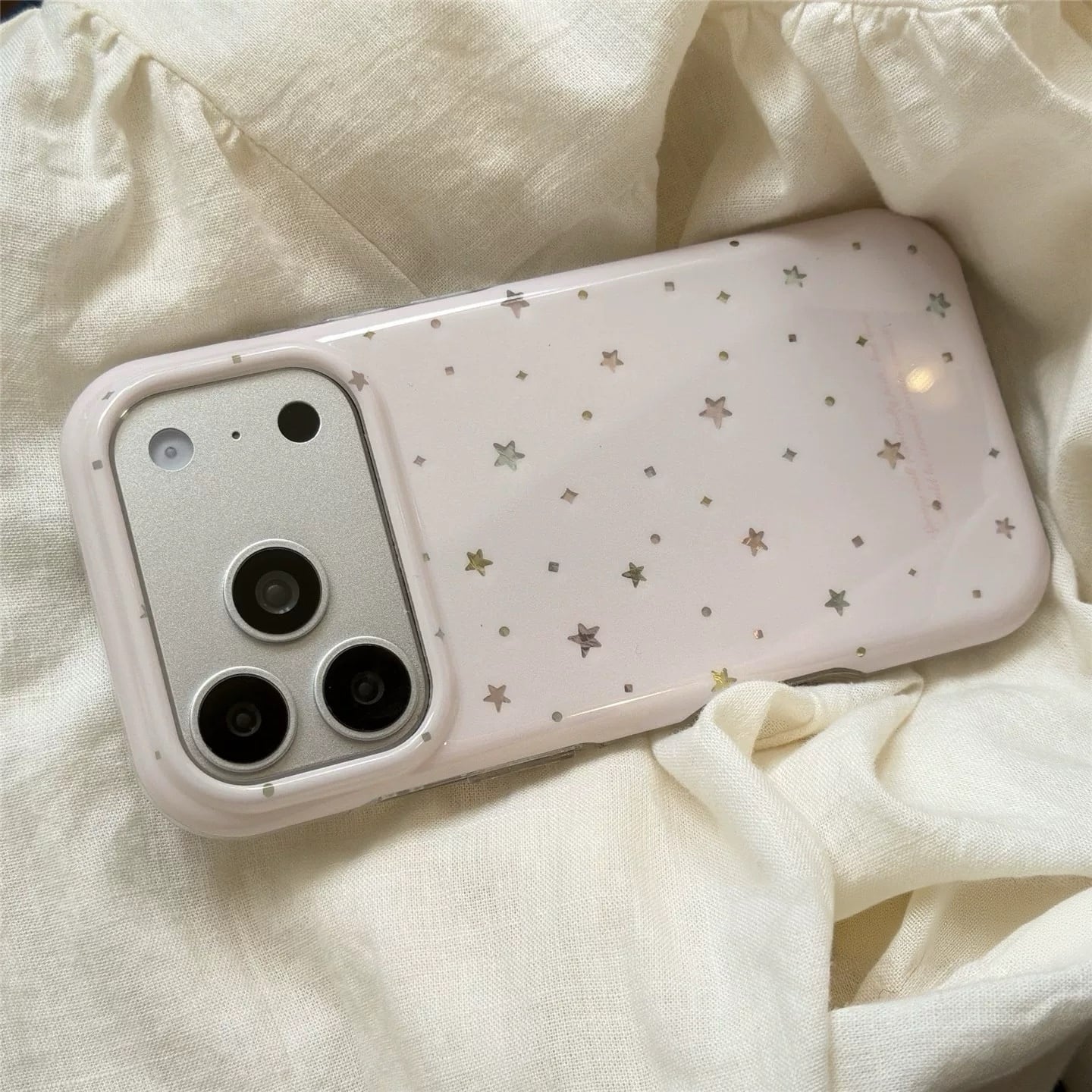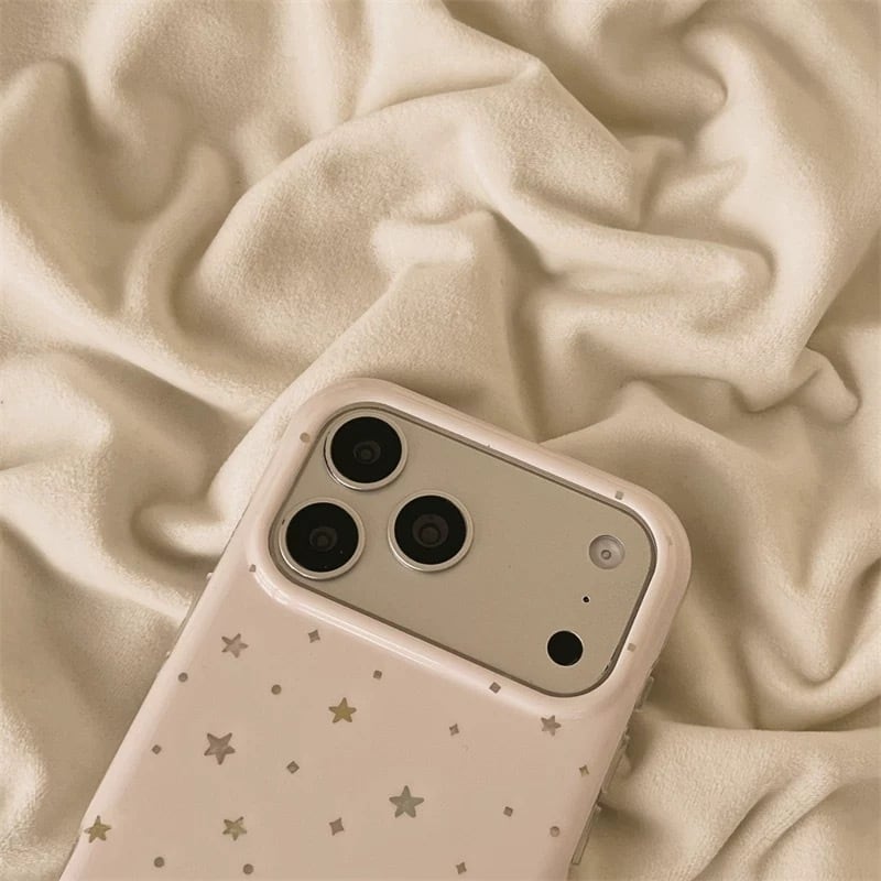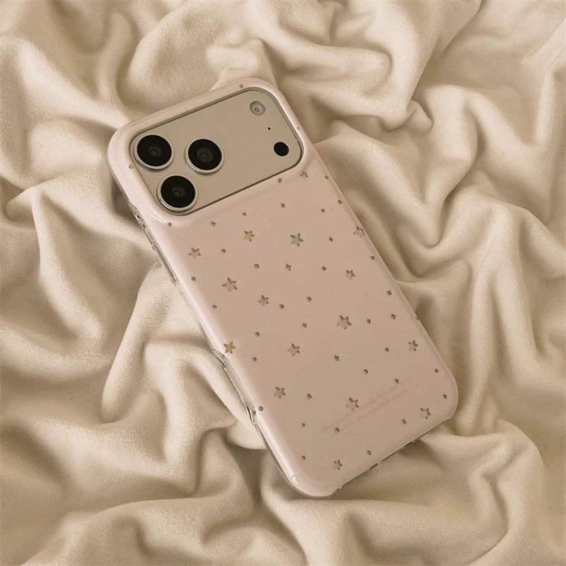 ほんのりピンクのやさしいカラーに、きらりと輝く星を散りばめたiPhoneケース。