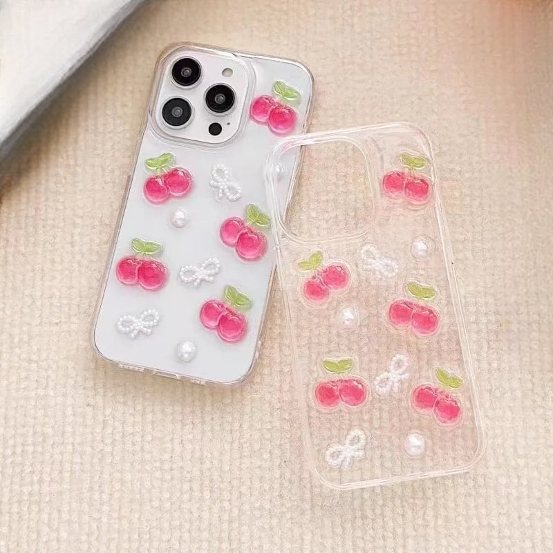 透明な素材がiPhoneの本来の美しさを保ちながら、さくらんぼとリボンのデザインが際立ちます。