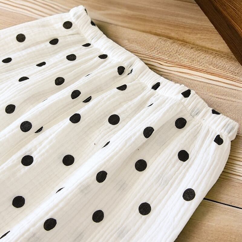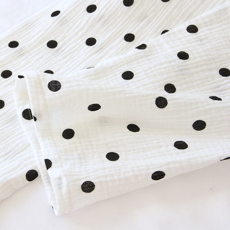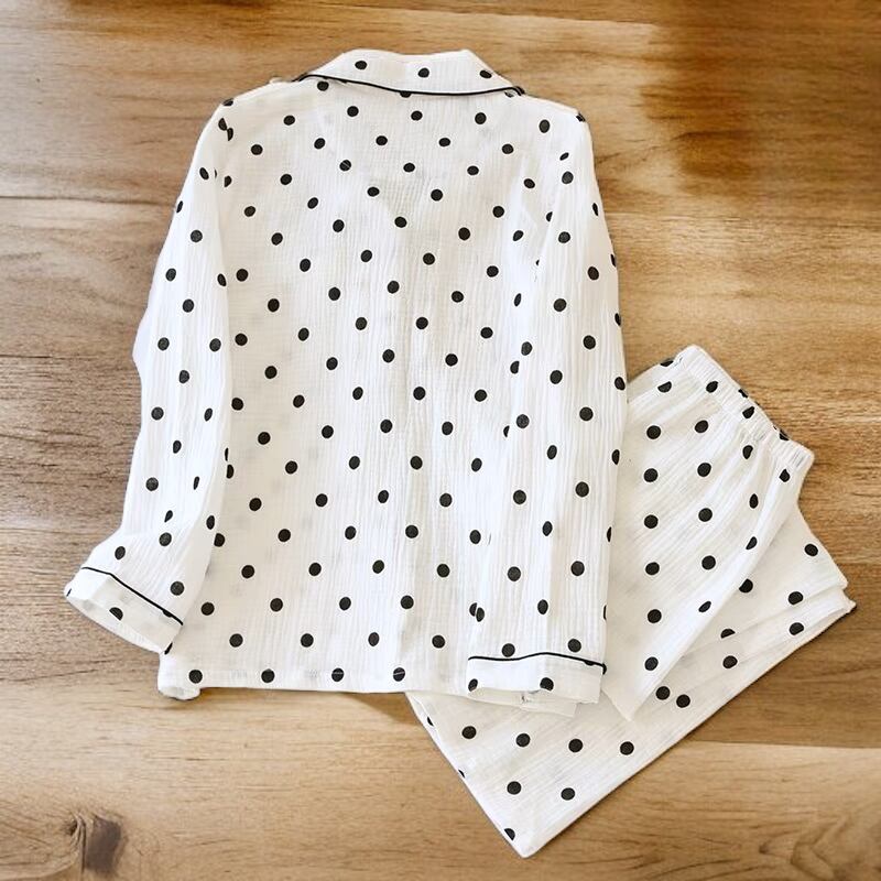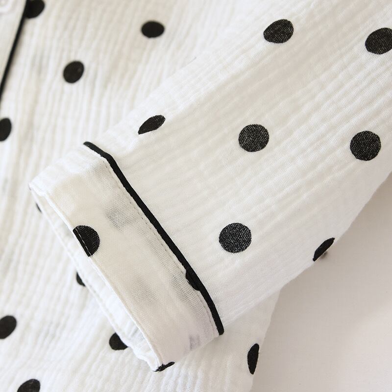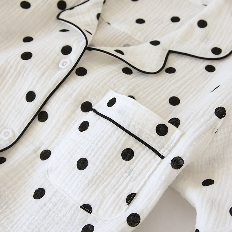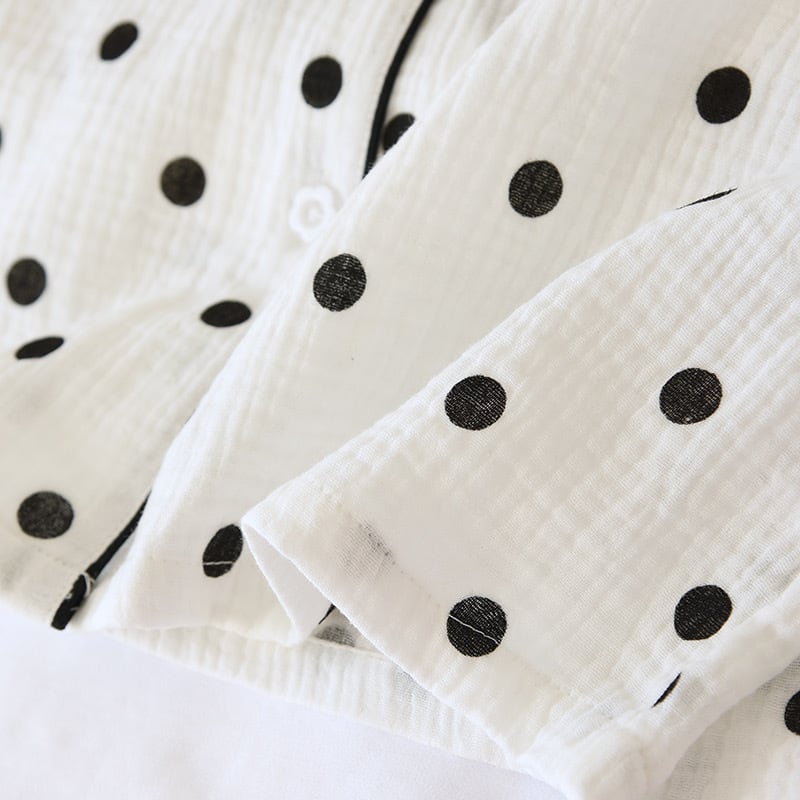 このパジャマは、清潔感のあるホワイトカラーに映える洗練された黒のドット柄が特徴です。