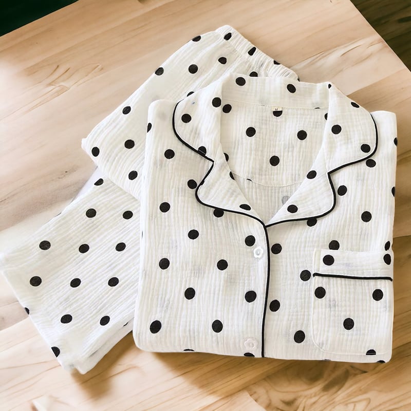 この洗練された黒のドット柄パジャマで、毎晩の睡眠をより快適でおしゃれな時間に!